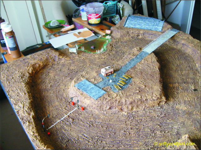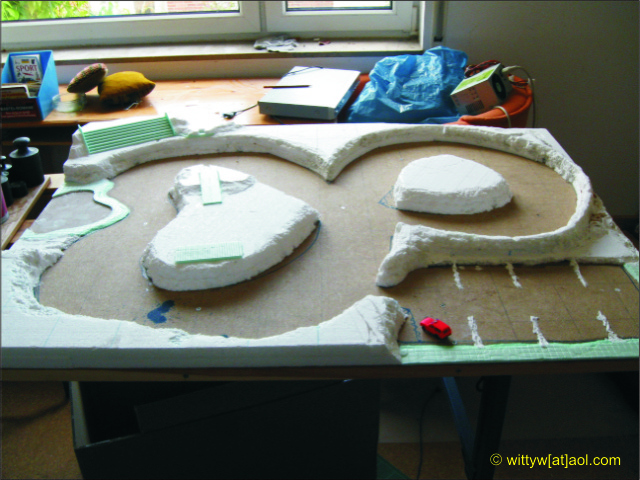 Die Löcher wurden mit mehreren Lagen Zeitungspapier und Leim geschlossen. Dann habe ich aus grob zugeschnittenen Styrodur-Resten die Außenböschung vorbereitet und noch zwei Stücke als Hindernisse auf die Fläche geklebt.