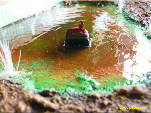 Nun ging es an die verbliebenen "weißen" Flecken - zuerst links am Rand der Teich. Begonnen habe ich damit, den Teichgrund zu bemalen und den Rand ein wenig zu bepflanzen. Dann wurde ein im Teich halb versunkenes Auto gebaut und in Position geklebt. Für das Wasser habe ich Vallejo "Still Water" versucht, aber mit ziemlichen Misserfolg. Überall im Uferbereich hat sich ein feines Muster aus Rissen (bis zu 1mm breit)gebildet und auch in der Fläche waren etliche. Ich habe dann festgestellt, dass die Risse fast unsichtbar werden, wenn man sie mit Klarlack auffüllt. Allerdings zieht der Lack beim Trocknen ein und die Risse sind wieder da. So habe ich ungezählte Schichten aufgebracht und insgesamt 4 Dosen Revell-Klarlack verbraucht. Dafür gibt es jetzt aber auch schöne Wellen auf dem Teich. Wie ich inzwischen erfahren habe, hätte ich den Untergrund vorher mit Klarlack behandeln müssen, damit er nicht so stark saugend ist.