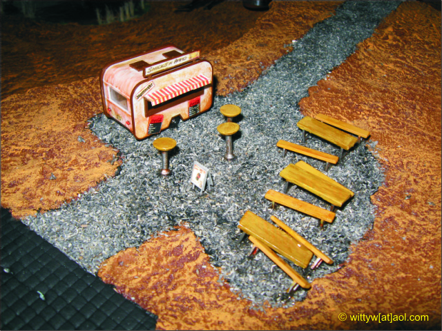 Jetzt war die linke "Insel" an der Reihe. Dort sollten eine Aussichtsplattform an Start und Ziel sowie ein Imbiss entstehen. Dafür wurde der Vollmer Imbisswagen (#5135) gebaut und (um)gestaltet. Der gesamte Bereich wurde schwarz grundiert und anschließend mit grauer Streu bedeckt. Dann konnte der Wagen mit einigen Bierzeltgarnituren und einer Werbetafel Position beziehen.